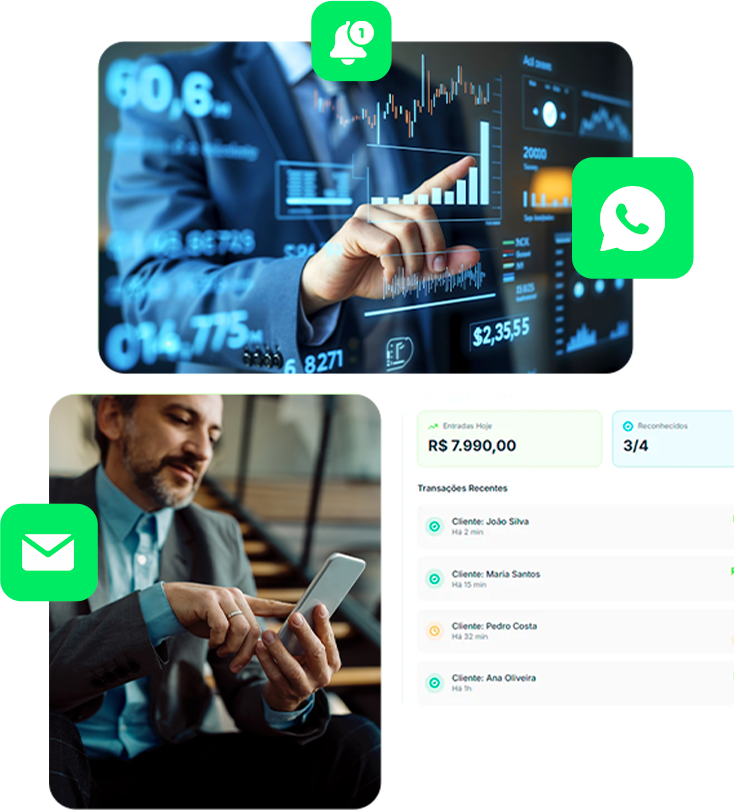 O Cobre Mais usa informações reais do seu ERP e bancos para disparar notificações no momento certo, registrar pagamentos e atualizar status em segundos — tudo sem intervenção manual.